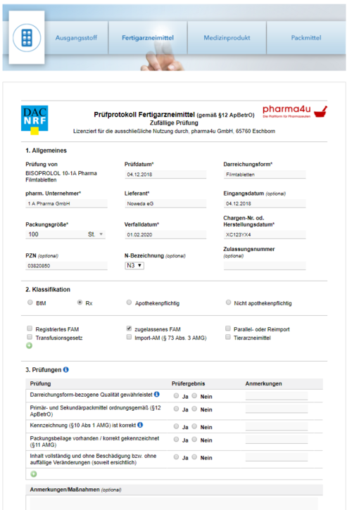 Abbildung: Protokoll der stichprobenartigen Prüfung von Fertigarzneimitteln