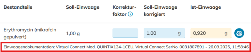 Waagendokumentation im Herstellungsprotokoll (nur bei Geräteanbindung)