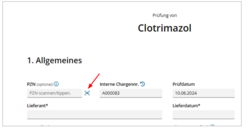 Beim Scan des PZN-Barcodes werden das PZN-Feld, der Hersteller und die Bezugsmenge automatisch ausgefüllt. Beim Scan des QR-Codes werden zusätzlich zu den obigen Daten die Chargenbezeichnung des Herstellers und das Verfallsdatum des Herstellers im Protokoll eingetragen. Die Daten werden in einem extra Pop-Up erfasst, können dort überprüft und dann übernommen werden: