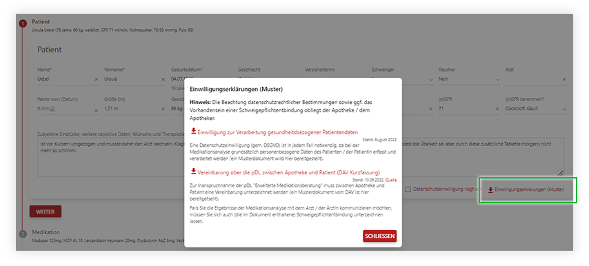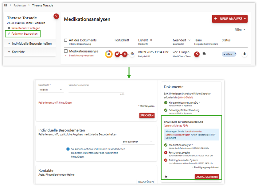 Ab sofort ist es im Bereich "Patienten bearbeiten" möglich, die Einwilligungserklärung für die Durchführung einer Medikationsanalyse, zu Forschungszwecken und für die Nutzung von KI digital signieren zu lassen. Auch das Ablehnen bzw. Widerrufen einer Zustimmung kann im MediCheck dokumentiert werden. Über den Button "Digital signieren" öffnet sich ein Fenster mit einer Anleitung und einem Link für die digitale Unterschrift.