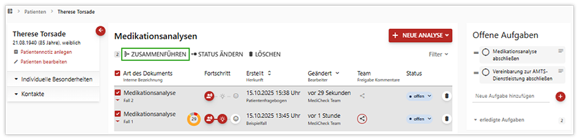 Ab sofort haben Sie in der individuellen Patientenakte die Möglichkeit, verschiedene Analysen zusammenzuführen. Wählen Sie dazu mindestens zwei Analysen aus und klicken Sie auf den anschließend erscheinenden Button "Zusammenführen".