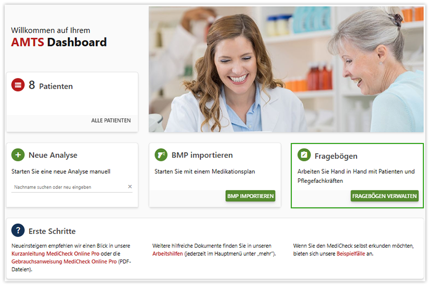 Das Dashboard auf der aktualisierten MediCheck-Startseite bietet Ihnen ab sofort einen direkten Zugriff auf die Verwaltung von Fragebögen für Patienten und Pflegefachkräfte.