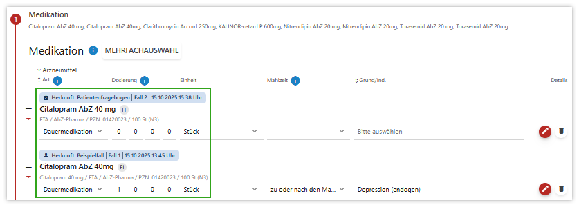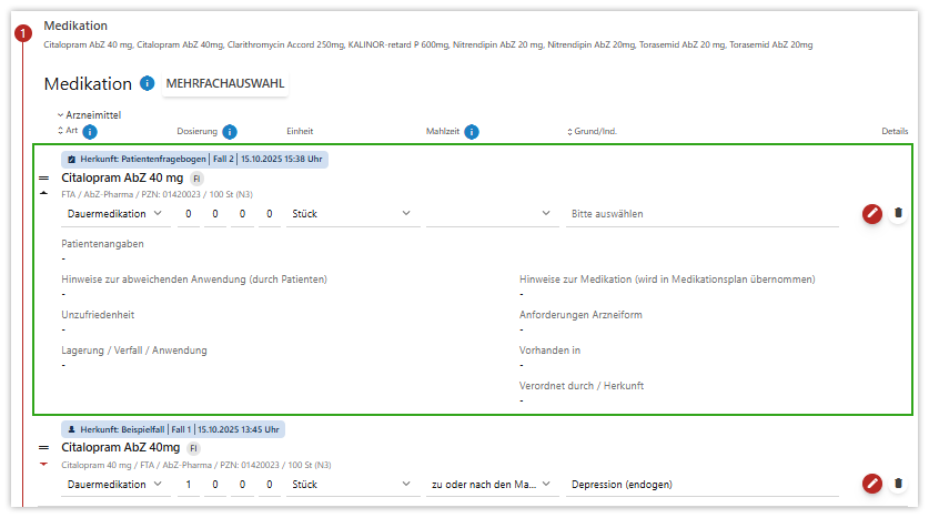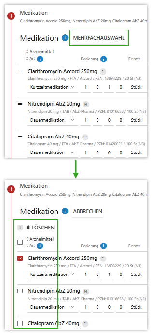 Ab sofort haben Sie über den Button "Mehrfachauswahl" die Möglichkeit, mehrere Medikationszeilen gleichzeitig zu löschen.