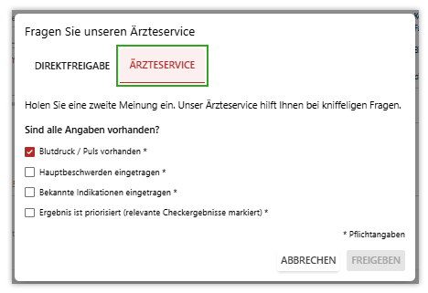 Nach Freischaltung steht Ihnen über den Fall-Sharing-Button am Ende des Analyseergebnisses oder im Bereich der individuellen Patientenakte in dem nun geöffneten Dialogfenster der Tab "Ärzteservice" zur Verfügung. Sind alle Pflichtangaben erfüllt und die Häkchen an den entsprechenden Stellen gesetzt, lässt sich der Fall direkt an unser Ärzteservice-Team freigeben.