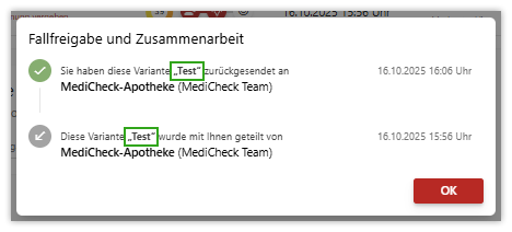Der Alias einer geteilten Variante wird ab sofort in der Verlaufsübersicht des Fall-Sharings angezeigt.