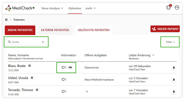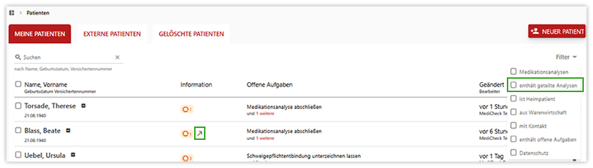 Sind für Patienten geteilte Fälle vorhanden, so wird dies in der Spalte "Information" mit einem Pfeil in der Patientenübersicht angezeigt. Ebenfalls lassen sich Patientenakten, die geteilte Analysen enthalten, über den Filter gezielt suchen.