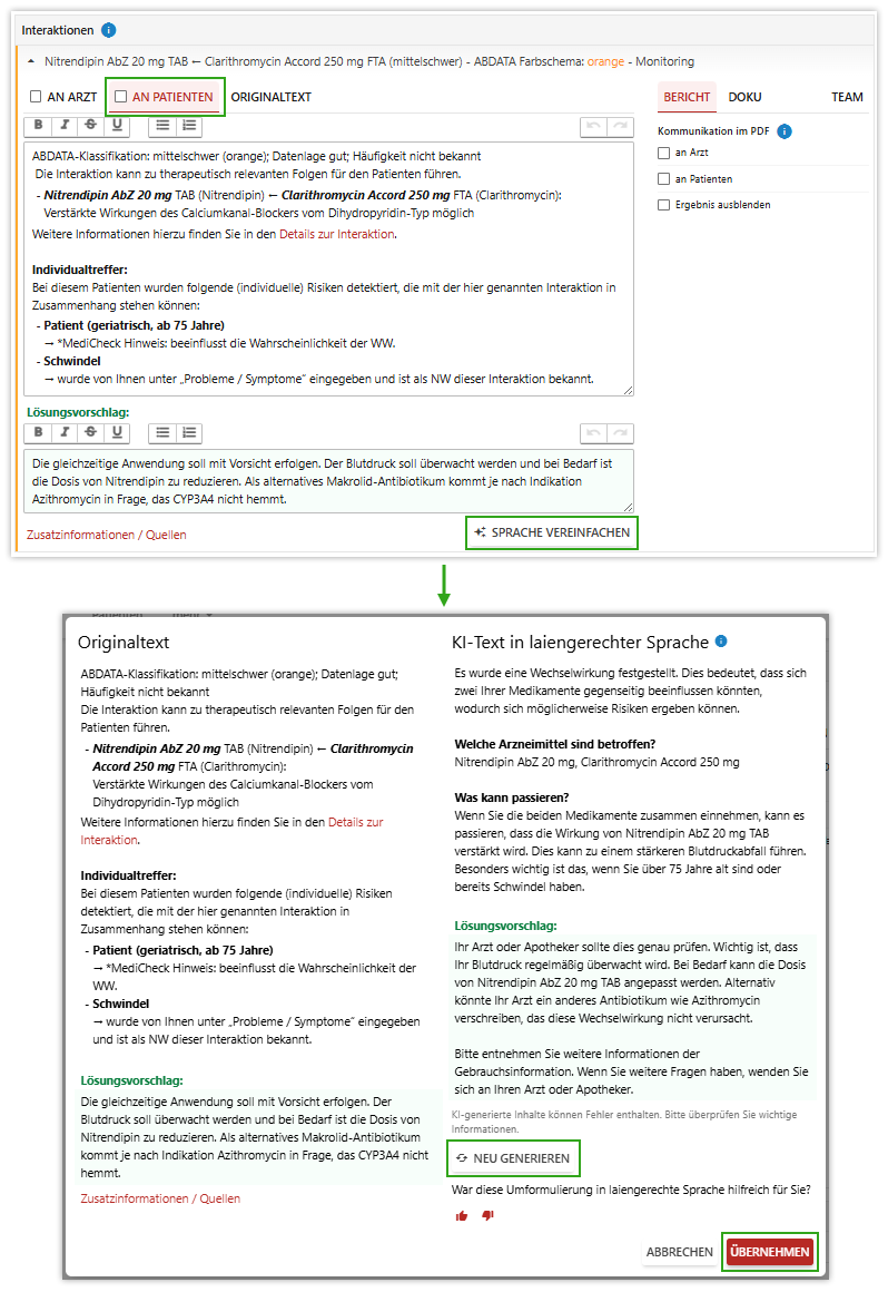 Im Bereich der Checktreffer "Interaktionen" und "Kontraindikationen" haben Sie für die Zielgruppe "Patienten" die Möglichkeit, durch Klick auf den Button "Sprache vereinfachen" den Text des Lösungsvorschlags in eine patienten- bzw. laiengerechte Sprache zu übersetzen. Weitere Checktreffer sind bereits in Arbeit.