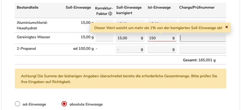 Warnhinweis im Herstellungsprotokoll bei Abweichungen der Ist-Einwaage vom Soll-Wert um mehr als 1%.