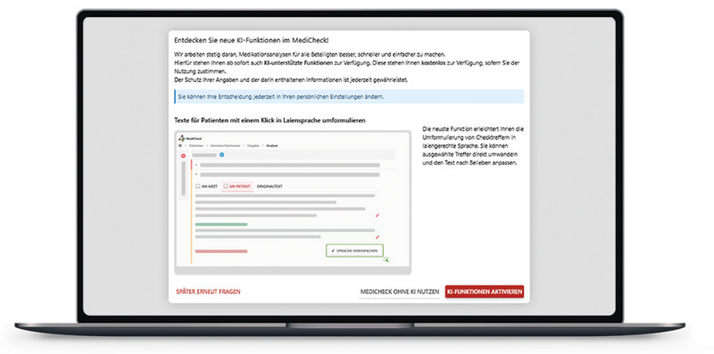 Mit unserem neuen KI-Tool übersetzen Sie ab sofort direkt im MediCheck komplexe Interaktionen und Kontraindikationen per Knopfdruck in leicht verständliche, patientengerechte Sprache. Erzielen Sie eine signifikant höhere Adhärenz, indem Sie Ihre Analyseergebnisse klar und verständlich kommunizieren.