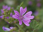 Allgemein: Borstig behaart Calyx; fünf ovale, hell- bis dunkelviolette Kronblätter. Die zahlreiche Staubblätter zu einer Röhre (= Columna) verwachsen, der Griffel trägt 10 fadenförmige Narben von ebenfalls violetter, häufig jedoch kontrastierender Farbe. Die Droge weist einen ausgeprägt schleimigen Geschmack auf.